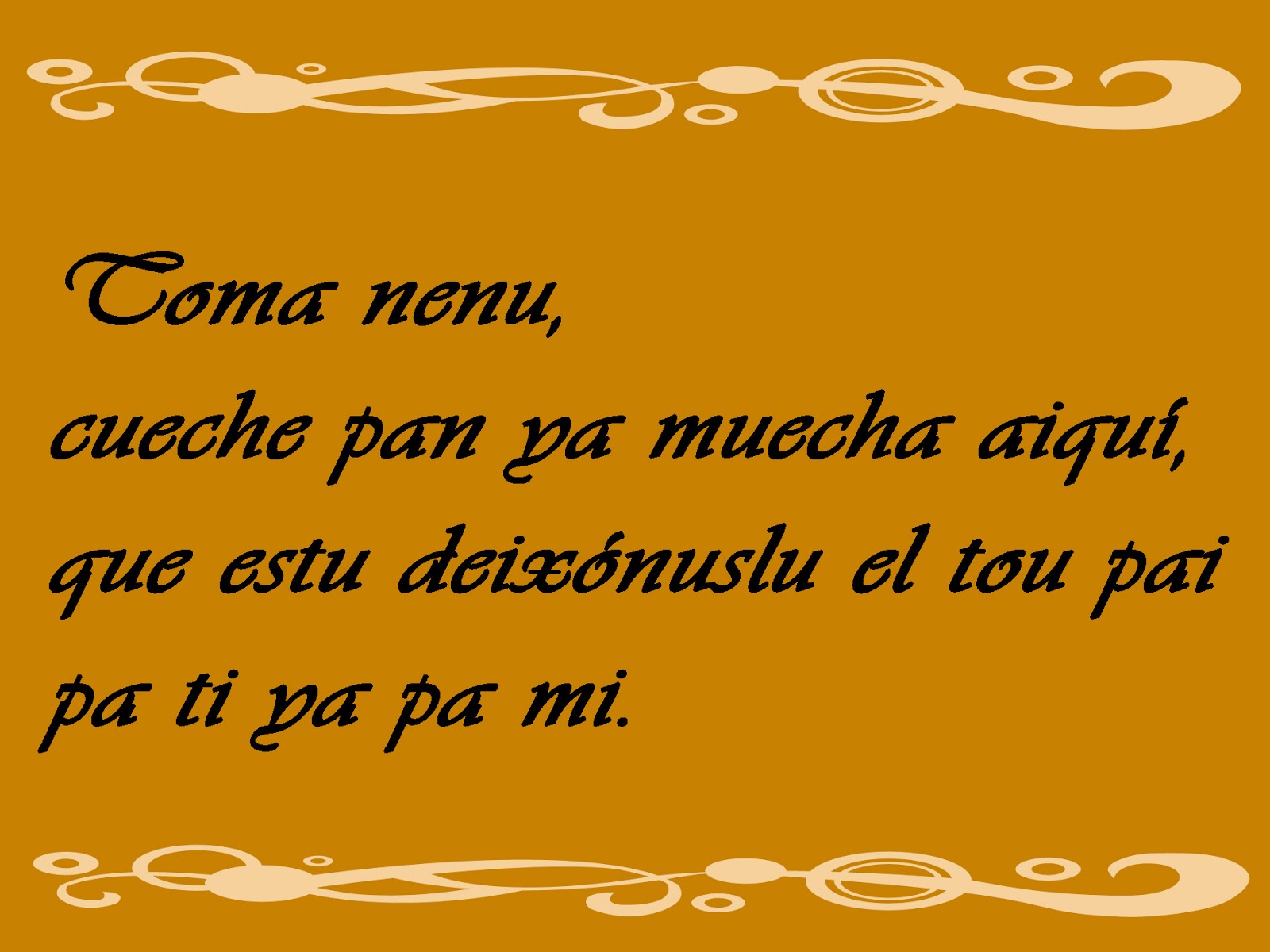 Dizse a los rapaces pa que xanten lluéu y nun envaanse. Se dice a los niños para que coman pronto y no se entretengan: Toma niño, coge pan y moja aquí, que ésto nos lo dejó tu padre para tí y para mí.